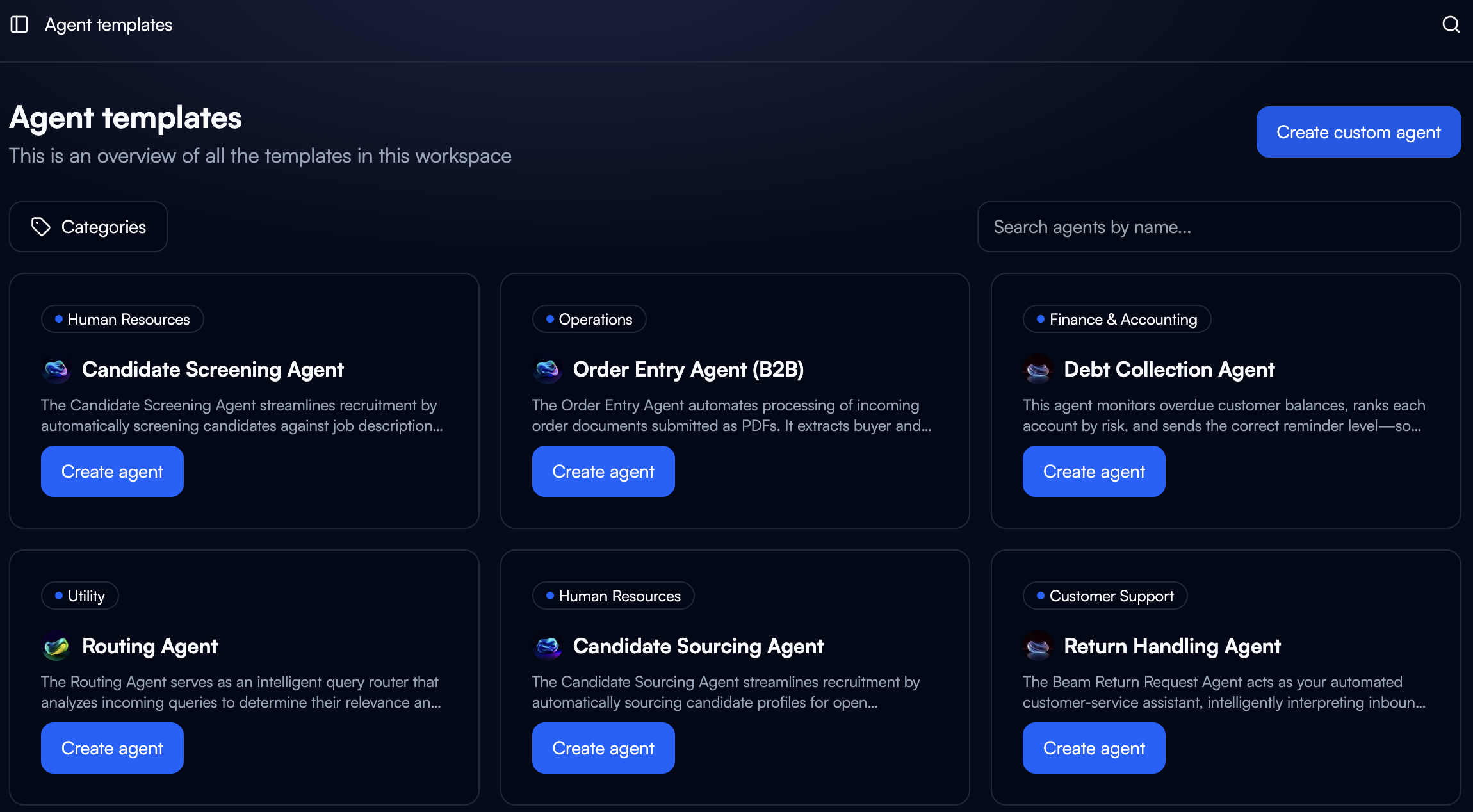 Navigate to Agent Templates in the sidebar or use the search bar to find “Create a new agent from a template”
