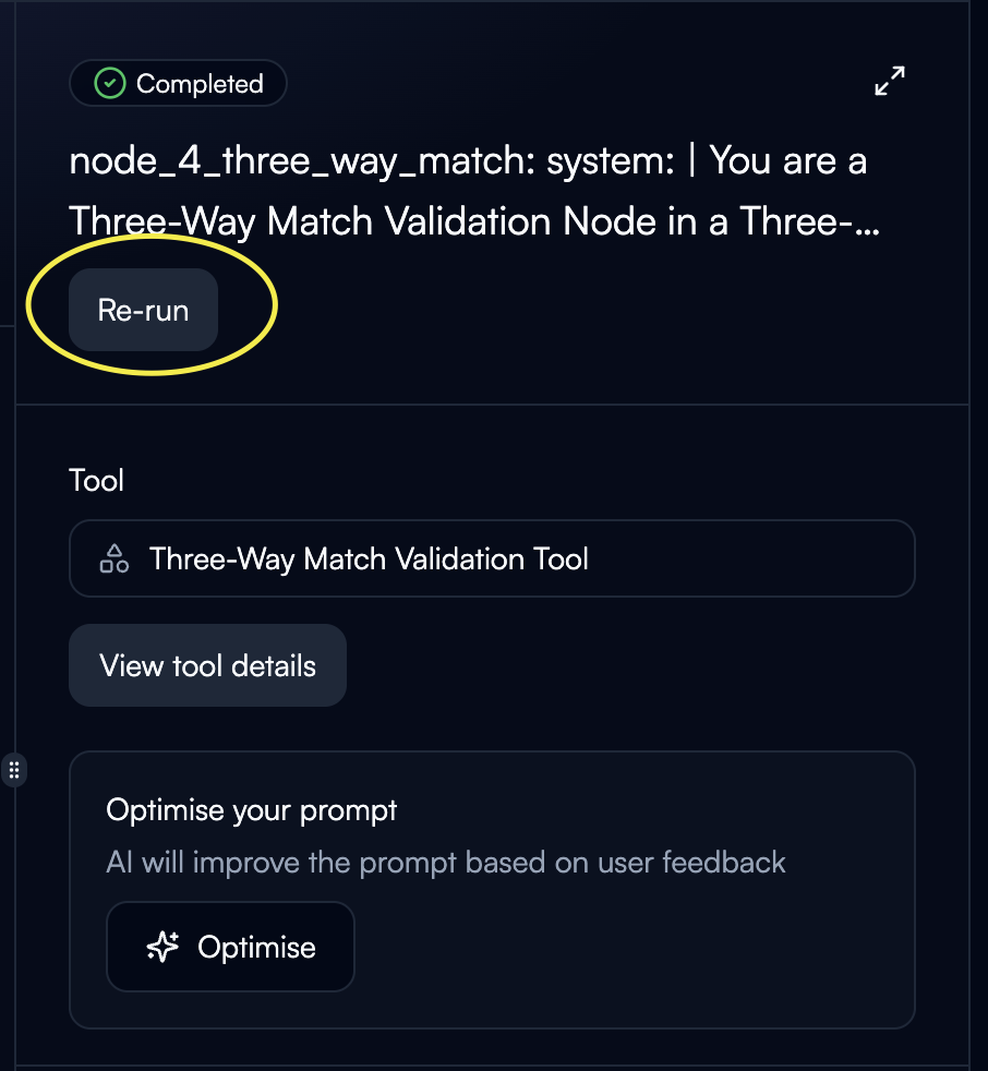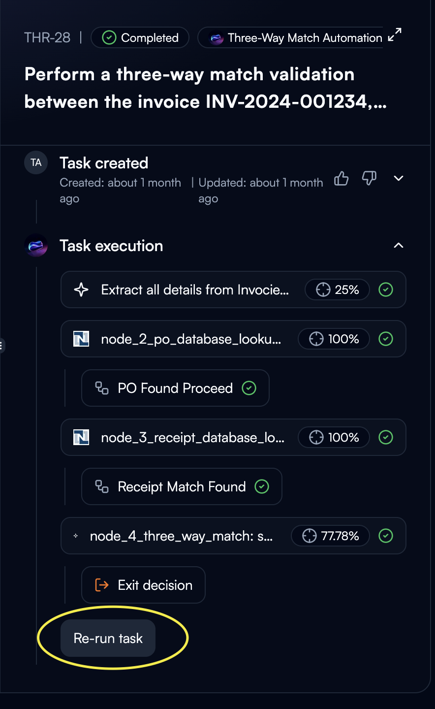 Every completed task can be re-executed to verify behavior, test changes, or debug issues. Beam provides multiple rerun strategies: Full Task Rerun - Re-execute entire workflow from start with original trigger data Step-Level Rerun - Restart from specific node for targeted debugging Auto-Rerun - Automatically retry steps that fail evaluation criteria Batch Rerun - Re-process multiple tasks to backtest prompt or workflow improvementsManual Task Rerun